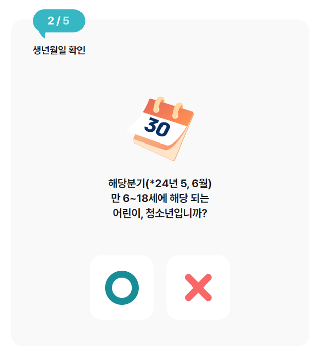 순서대로 O, X 를 체크하시면 마지막에 지원 신청이 가능한지 불가능한지를 알려 줍니다.